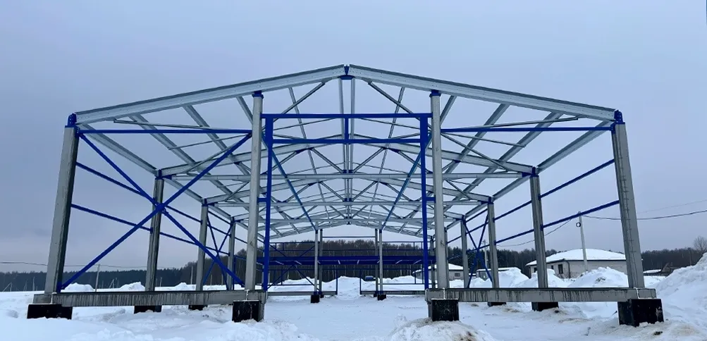Проект предусматривает каркасное решение с использованием стальных колонн и ферм. Основные элементы конструкции: